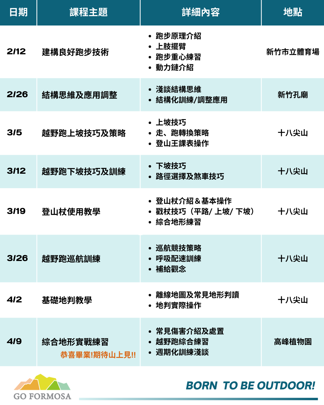 本技術班共含8堂課,將會教授越野跑完整技巧、競技策略、結構化思維、訓練觀念、補給概念及山域環境技能...等專項內容,用紮實且系統化的教學讓大家更容易升級越野技能,聰明的學習、訓練將帶來更好的體驗及降低運動傷害風險,期許大家跟著我們一步步完成課程,享受更安全暢快的越野生活!