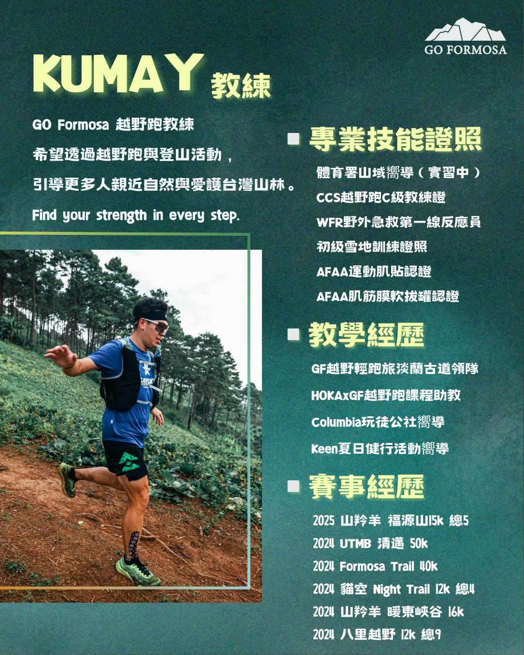 【越野跑】是一項結合路跑與登山的戶外活動,透過學習掌握技巧後,能有效提升心肺能力、協調性及跑動經濟性,進而用更輕快無負擔的方式去享受山林!