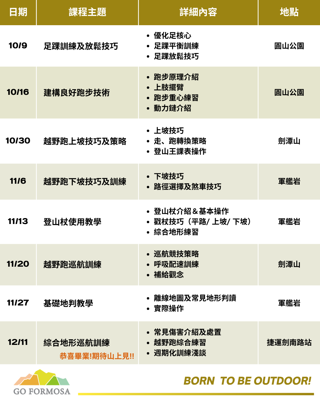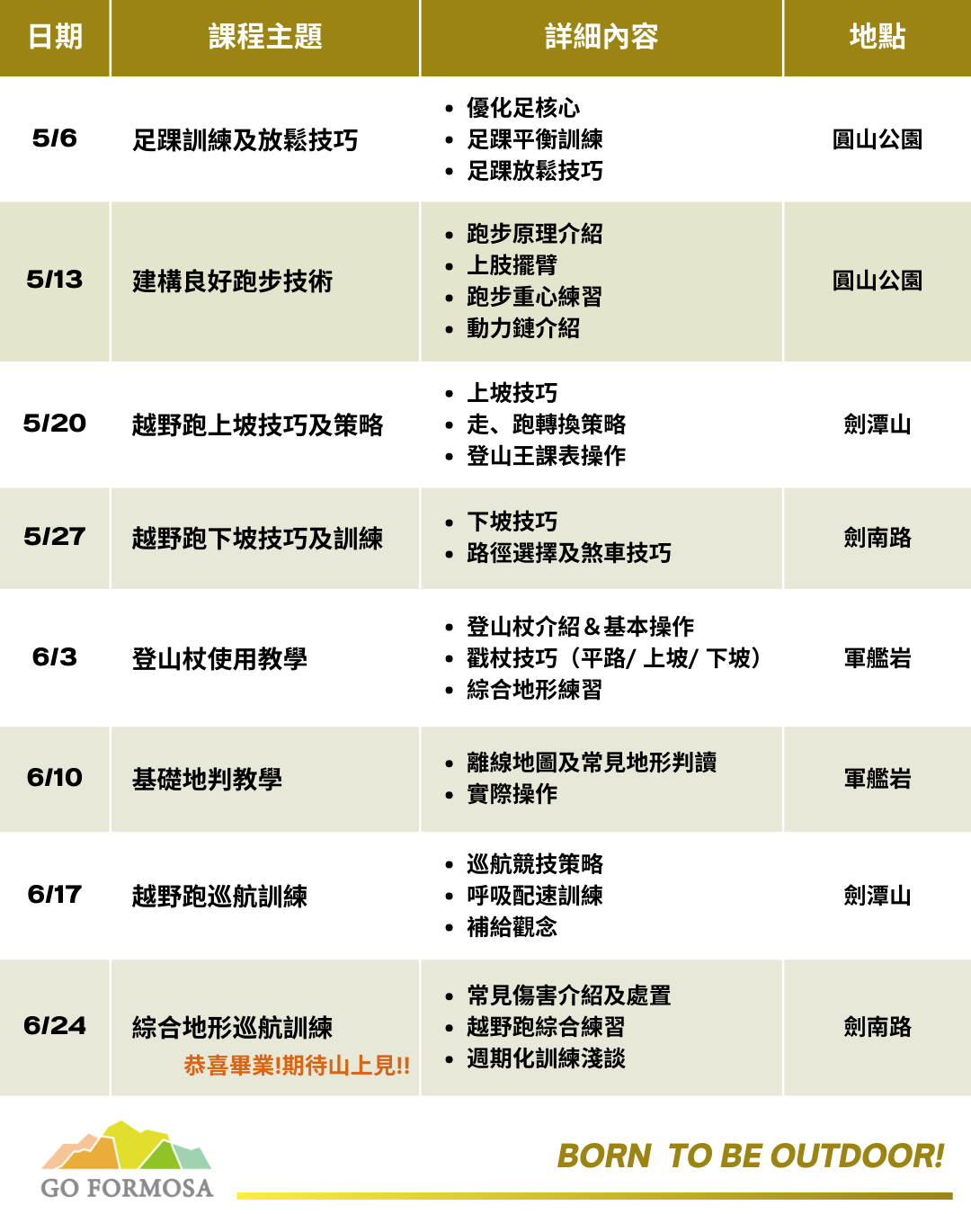 本技術班共含8堂課,將會教授跑步技術、越野進階技巧、競技策略、訓練觀念、補給概念及山域環境技能...等專項內容,用紮實且系統化的教學讓大家更容易升級越野技能,聰明的學習、訓練將帶來更好的體驗及降低運動傷害風險,期許大家跟著我們一步步完成課程,享受更安全暢快的越野生活!