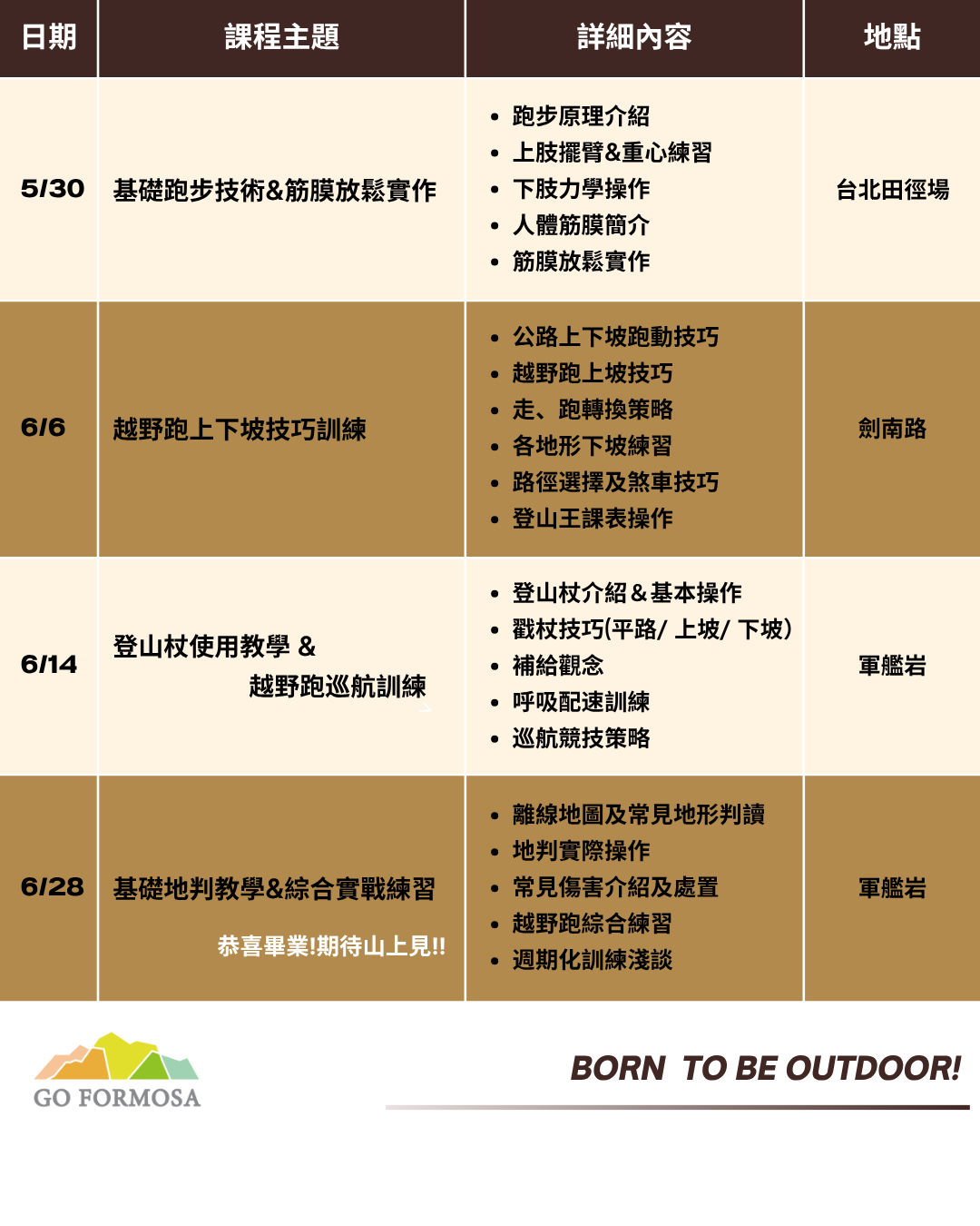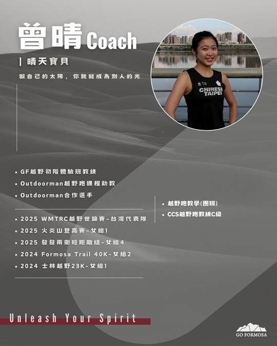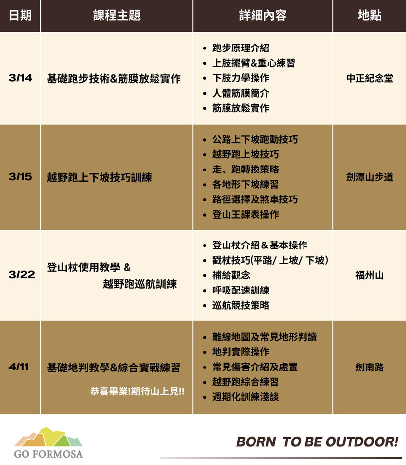 本週末技術班共含4堂課共16小時,將會教授越野跑完整技巧、競技策略、筋膜放鬆、訓練觀念、補給概念及山域環境技能…等專項內容,用紮實且系統化的教學讓大家更容易升級越野技能,聰明的學習、訓練將帶來更好的體驗及降低運動傷害風險,期許大家跟著我們一步步完成課程,享受更安全暢快的越野生活!