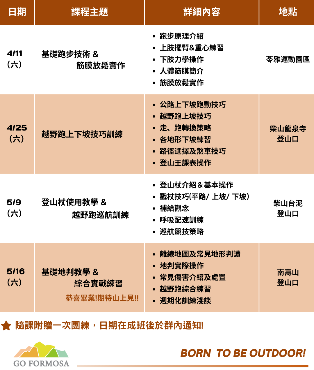本技術班共含4堂課共16小時,將會教授越野跑完整技巧、競技策略、筋膜放鬆、訓練觀念、補給概念及山域環境技能…等專項內容,用紮實且系統化的教學讓大家更容易升級越野技能,聰明的學習、訓練將帶來更好的體驗及降低運動傷害風險,期許大家跟著我們一步步完成課程,享受更安全暢快的越野生活!
