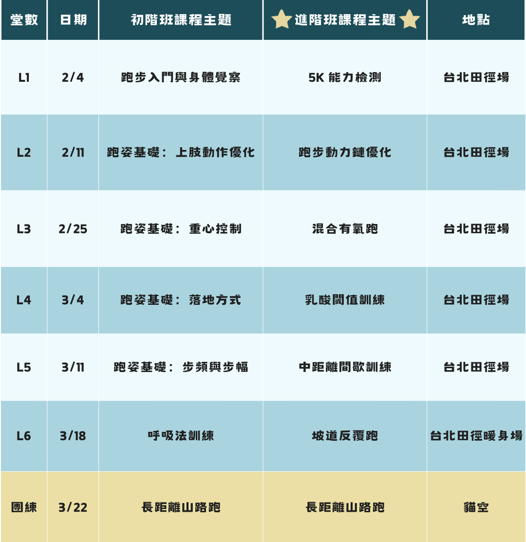 新的一季除了延續跑動基礎養成,也新增 進階班課程 主題,更專注在訓練上。透過階段性的課綱安排,從跑姿、節奏到速度與耐力轉換,不論你正建立跑步習慣,或希望持續提升訓練強度,都能找到適合自己的訓練節奏。