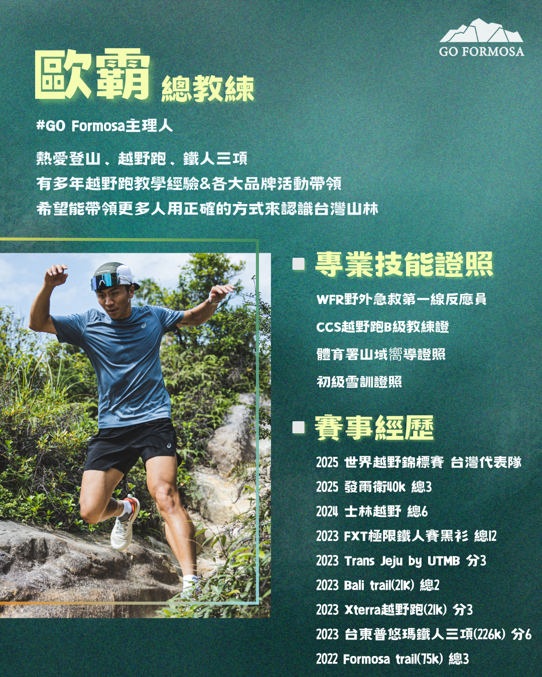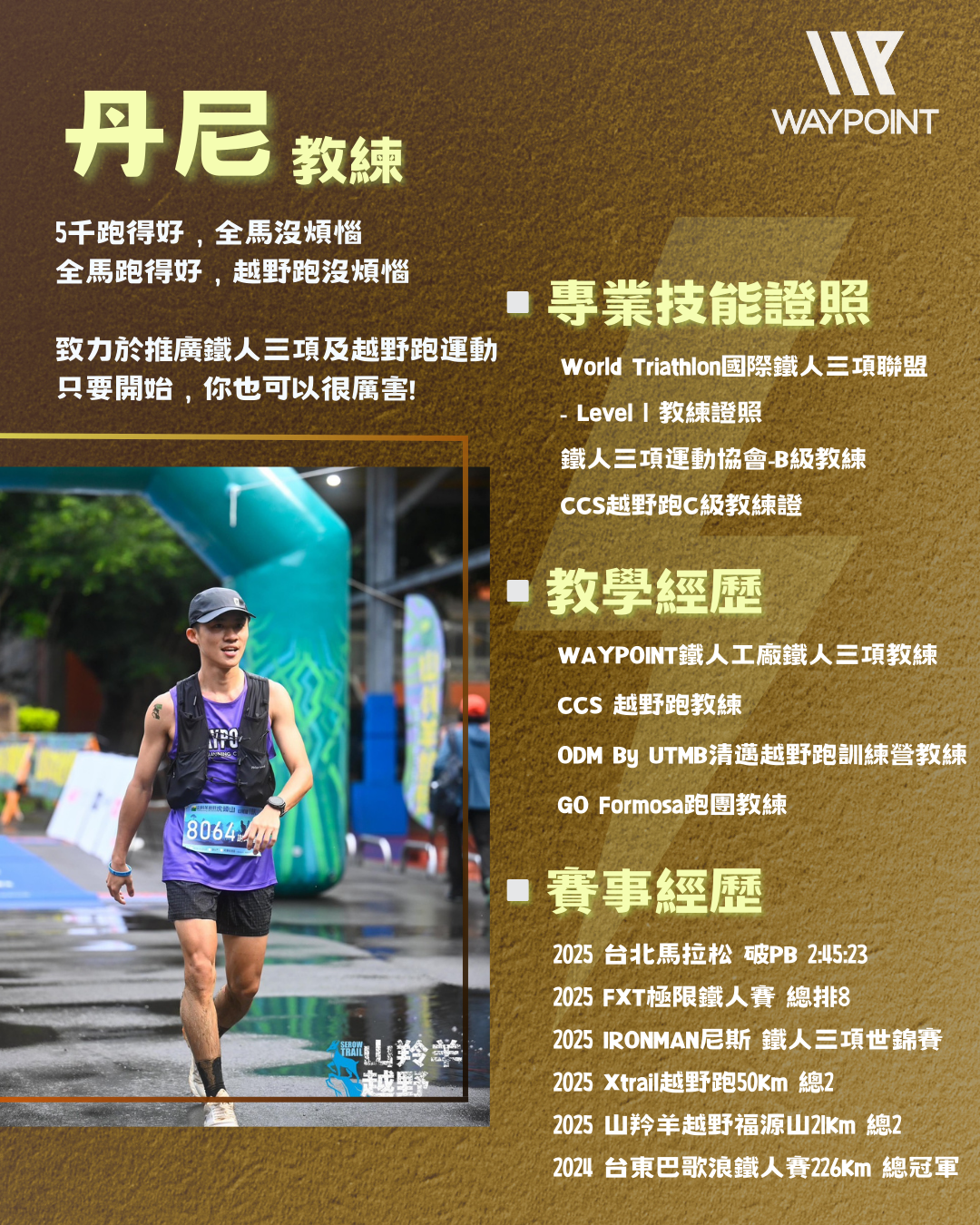 跑步不難,但要跑的好就很難,跟 WAYPOINT鐵人工廠 合作開設路跑班,提供完整的跑步訓練系統,2位主帶教練除了跑步以外,尚有豐富的 越野跑 及 鐵人三項 經驗,期許用更廣闊的視角來帶大家看待跑步這項運動,跑步可以是專項運動、也可以是個輔助訓練、更可以是日常調劑身心的好工具,相信對於每個人的意義都不盡相同,但不管如何 跑的健康快樂 絕對是我們共同目標,這會是個紮實、多元又有趣的學習空間,一起來感受並交流吧!